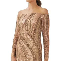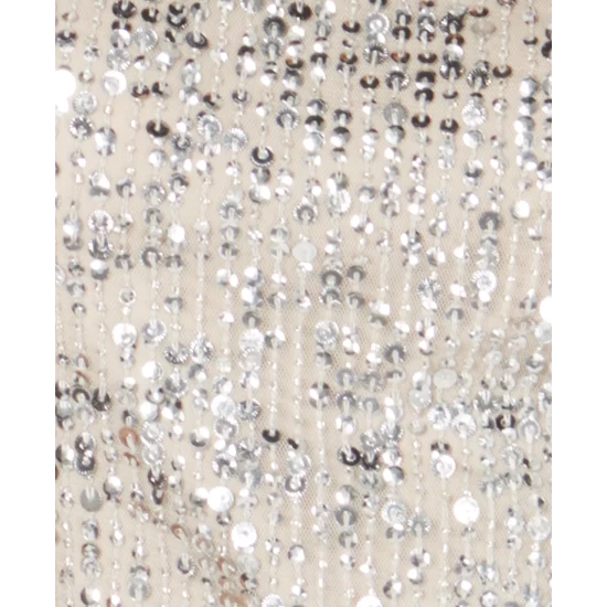 - Allover sequins on mesh; tiered beaded fringe detail at hem; hand beaded
