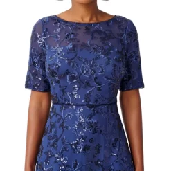 - Allover beads and sequins; godet mesh insets at hem