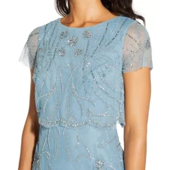 Dazzling by design, Adrianna Papell’s party-perfect beaded dress features an airy mesh overlay finished with scalloped edging.