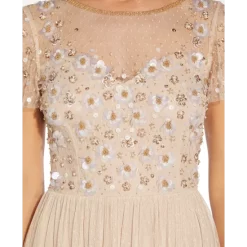 Your next event will look spectacular in this shimmery A-line dress from Adrianna Papell designed with embroidered detail throughout the enviable silhouette.