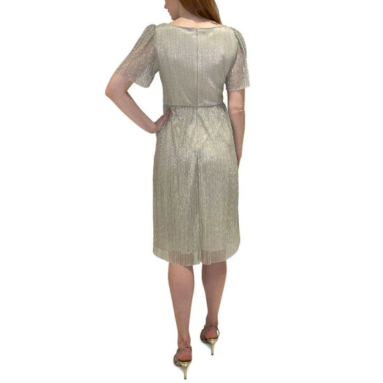 Adrianna Papell’s dress shines with metallic pleating, a keyhole and figure-defining ties below the bust.