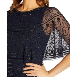 A cape overlay lends a regal feel to Adrianna Papell’s beaded cocktail dress.