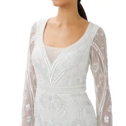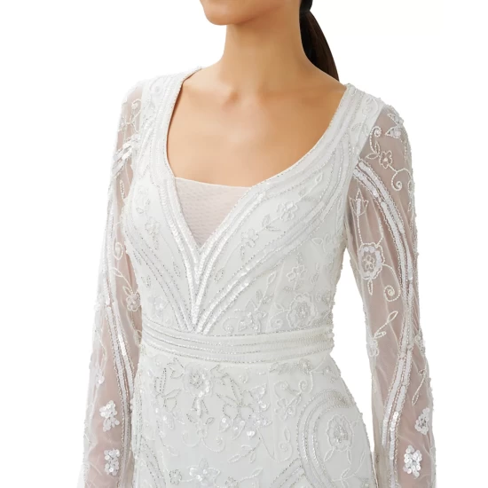- Sequins may shed during wear; damage to beading can occur during try-on or wear