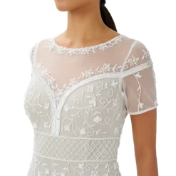 Neutral hues bloom in the sparkling sequins, shiny beads and dimensional dazzle embellishing this chic elbow-sleeve sheath from Adrianna Papell.