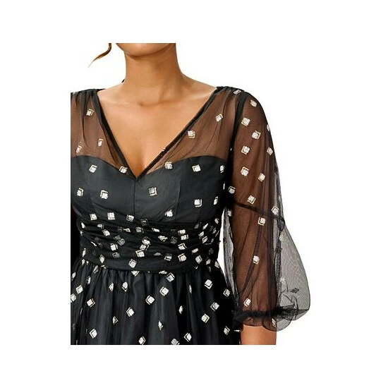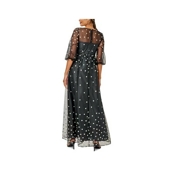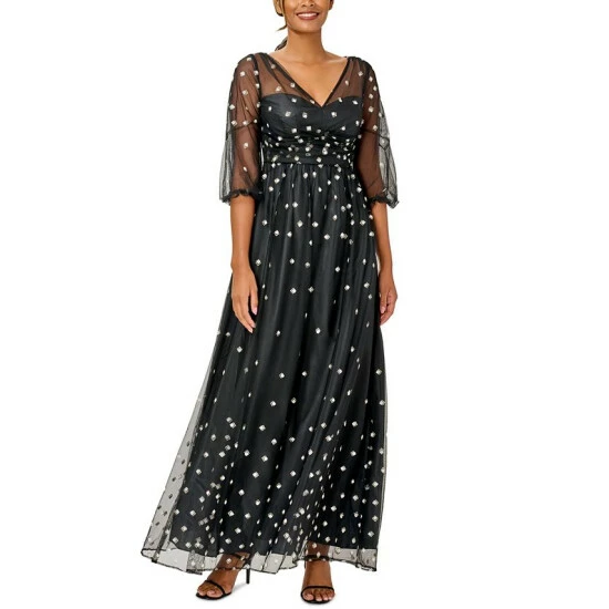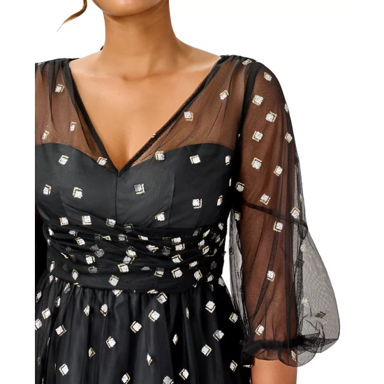 Dusted with diamond-shaped metallic dazzle, Adrianna Papell’s fit & flare gown enters any venue with an elegant air.