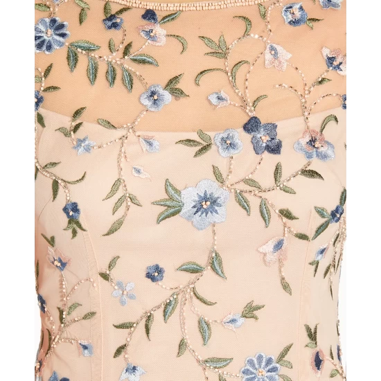 - Blouson detail at top; allover floral embellishment