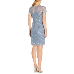 Swingy hemline fringe finishes the sleek shape of Adrianna Papell’s streamlined sheath that’s elegantly embellished with shiny sequins and sparkling beads.