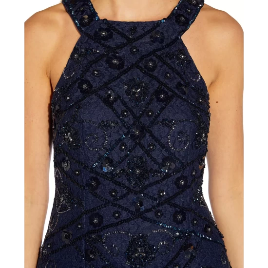 - Allover bead and sequin embellishments; cutout detail at shoulder