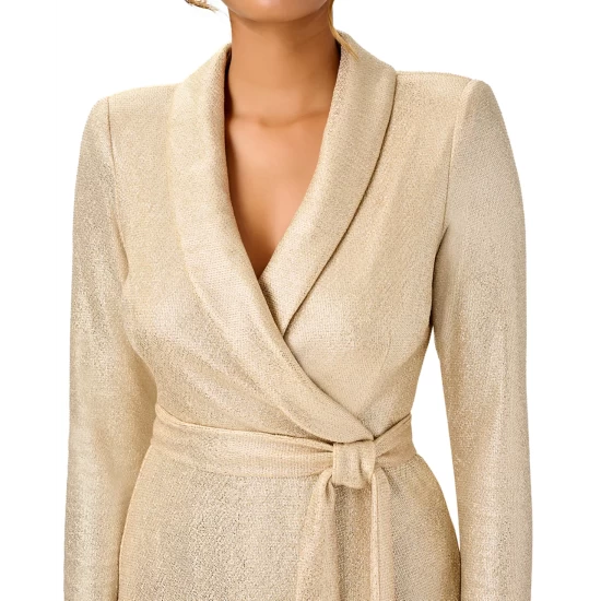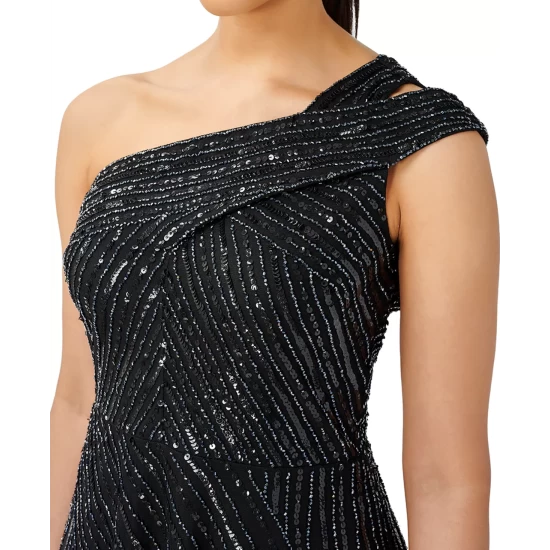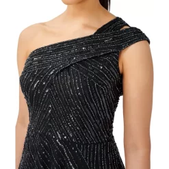 Shimmery lines of shine illuminate Adrianna Papell’s stunning dress featuring a sleek cutout at the crossover shoulder strap.