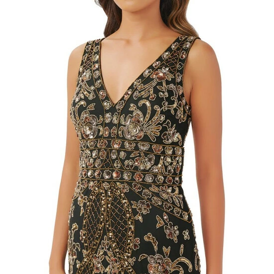 Regally radiant with beaded and sequined embellishments, Adrianna Papell’s flowing V-neck gown could make you feel like royalty.