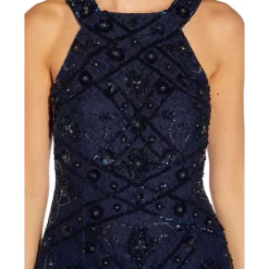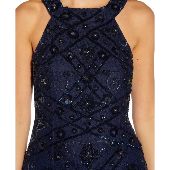 Luminous embellishments sparkle on the sheer top of layer of Adrianna Papell’s stunning split-sleeve gown.