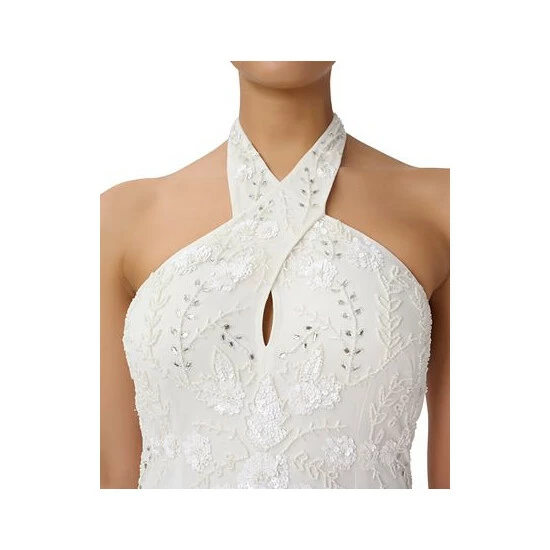 - Halter neckline; Sheath silhouette