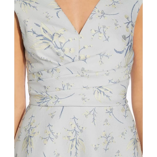 An elegant floral jacquard brings a graceful air to Adrianna Papell’s flattering fit and flare dress, a V-neck design finished with unique asymmetric pleats at the waist.