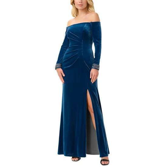 An off the shoulder neckline lends a flattering look to this gown from Adrianna Papell, finished with embellishments at the cuffs for a polished look.