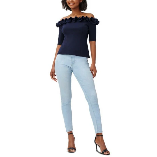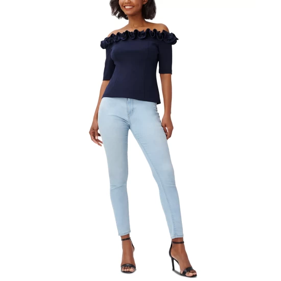 Look ravishing in ruffles with Adrianna Papell’s off-the-shoulder top.