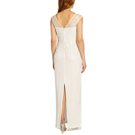 Create a sensation in this floor-length sequined illusion gown from Adrianna Papell, styled with a low V-back neckline.